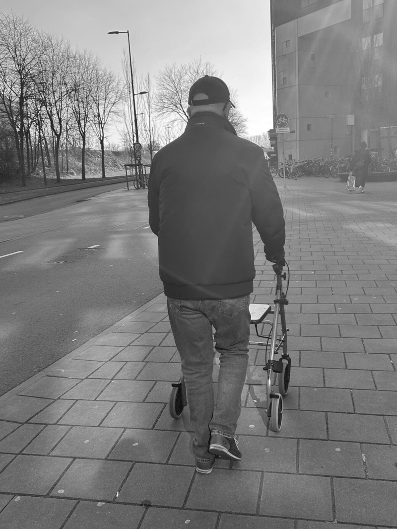 Bij een trip naar familie in Spanje bleek de beschikbaarheid van een rolstoel op Schiphol een uitkomst. Door er geen dramatisch verhaal van te maken was het gewoon een praktische oplossing om de lange wandelgangen te overbruggen. Tom heeft inmiddels een rollator te leen ‘op proef’ en ook daar heeft hij, hebben wij samen, al mee geoefend. Knap lastig bij obstakels op de weg, bij drempels en trappen zijn helemaal een uitdaging. De zelfstandig te belopen afstand wordt alsmaar korter. Een tussentijdse mogelijkheid om te gaan zitten en uit te rusten blijkt wenselijk zo niet noodzakelijk.